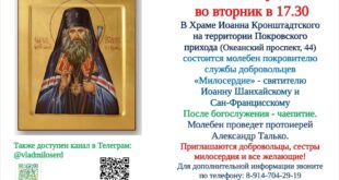 Молебен для добровольцев и всех, кто творит добро! 🕊️ Дорогие друзья! Приглашаем вас на молебен святителю Иоанну Шанхайскому и Сан-Францисскому — небесному покровителю службы добровольцев «Милосердие». Ждём вас: 🗓7 октября, во вторник ⏰В 17:30 📍В Храме Иоанна Кронштадтского (Покровский приход, Океанский проспект, 44) Молебен проведёт протоиерей Александр Талько. После службы всех гостей ждёт душевное чаепитие, где можно будет пообщаться. Мы ...