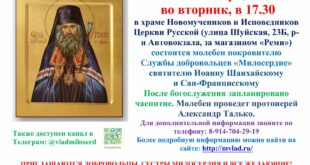 4 ноября (вторник), 17:30 Храм Новомучеников и Исповедников Церкви Русской Адрес: ул. Шуйская, 23Б (район Автовокзала, за магазином «Реми») Молебен святителю Иоанну Шанхайскому и Сан-Францисскому, который является покровителем Службы добровольцев «Милосердие». Контактная информация для справок: Телефон: 8-914-704-29-19 Канал в Телеграм: @vladmloserd Приглашаются: добровольцы, сёстры милосердия и все желающие!