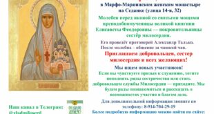 21 октября в храме святого благоверного князя Александра Невского на территории Марфо-Мариинского женского монастыря состоялся молебен в честь святой преподобномученицы Великой Княгини Елисаветы Феодоровны — небесной покровительницы сестер милосердия. Богослужение совершил протоиерей Александр Талько. Молитва проходила перед особо чтимой иконой святой Елисаветы с частицей ее мощей, что придало событию особую торжественность и благоговение. На молебен собрались сестры милосердия, добровольцы и ...